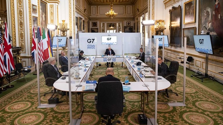△七国集团外长会带有透明隔断的会议现场