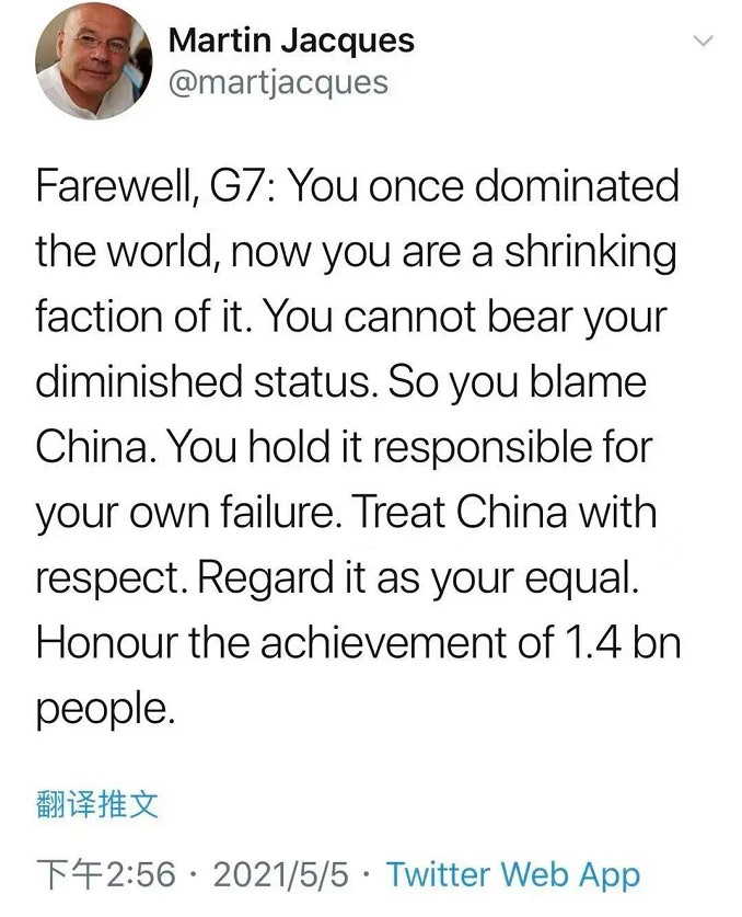 就在G7联合声明发布当天,英国知名学者马丁·雅克在社交媒体上发文,对主要西方国家妄图借七国集团的舞台动员印度洋-太平洋地区的国家对中国进行全面围堵进行了痛批和无情控诉。