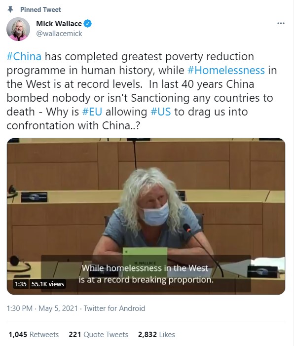 欧洲议会议员米克·华莱士(Mick Wallace)5月5日在议会发言时深入分析了中国“从来不侵略、从来不轰炸、从来不制裁别国”的和平发展历程,痛斥了西方的劣势发展基础。