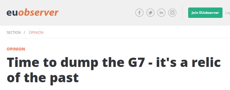 在G7外长会召开前夕,欧洲媒体《欧盟观察者》(EU Observer)在其网站刊发评论文章《是时候抛弃G7了,它是历史遗物》。