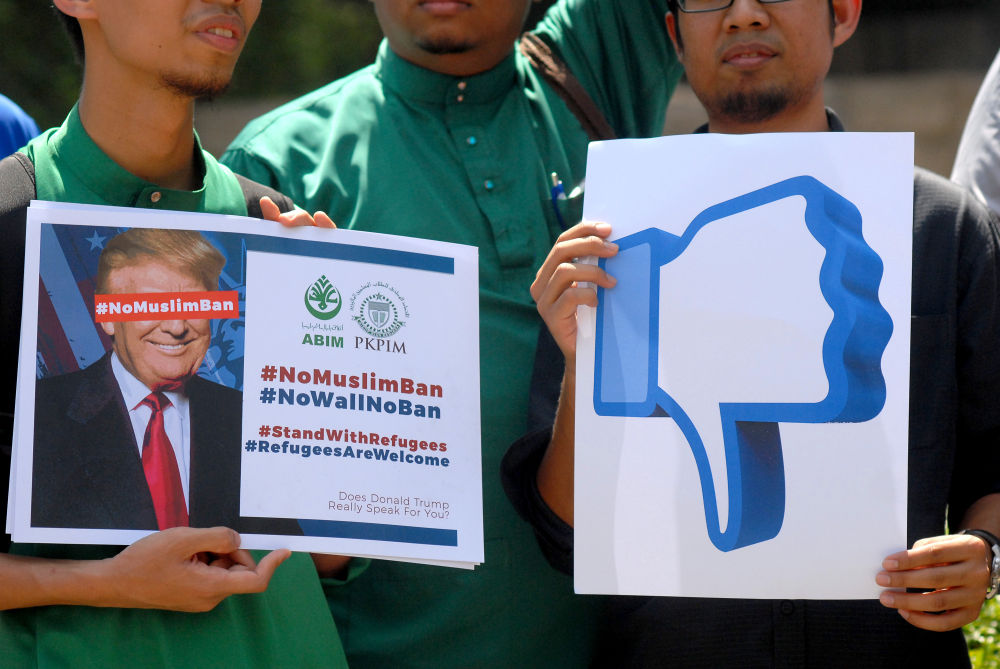 2017年2月3日,在马来西亚首都吉隆坡,集会者展示抗议特朗普的标语。当天,部分马来西亚团体和民众在吉隆坡美国大使馆前集会,抗议时任美国总统特朗普此前签署行政令禁止7个穆斯林国家公民入境美国。(新华社发,张纹综摄)