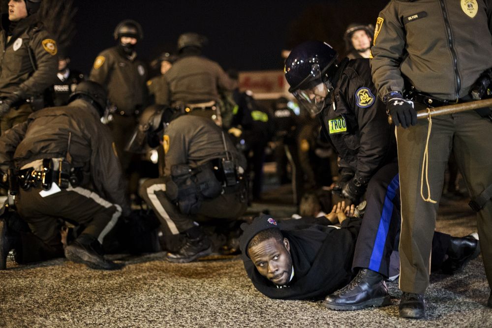 2014年11月28日,警察在美国密苏里州弗格森警察局前逮捕示威者。当晚,约100多名示威者阻断了弗格森警察局前的交通,抗议美国密苏里州圣路易斯县大陪审团决定不起诉枪杀非洲裔青年迈克尔·布朗的白人警察达伦·威尔逊。(新华社发,吉姆·冯德鲁什卡摄)