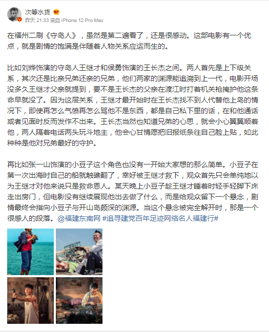 网络名人@次等水货表示,在福州二刷《守岛人》,虽然是第二遍看了,还是很感动。这部电影有一个优点,就是剧情的饱满是伴随着人物关系应运而生的。网络名人@开水族馆的生物男表示:拍摄细腻情感真挚,四星好评。催泪,感性的朋友们记得备足纸巾。