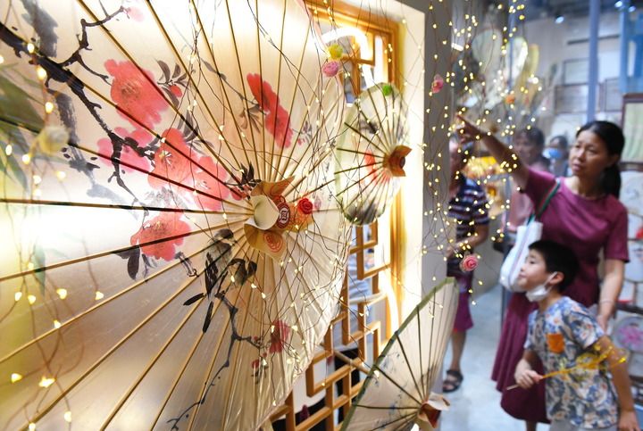 ↑7月13日,游客在福州南后街观赏福州油纸伞。