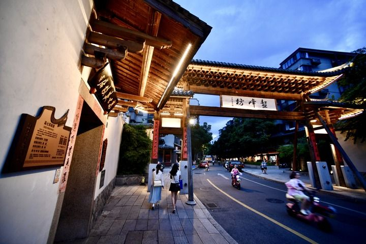 ↑7月14日,行人经过福州朱紫坊牌楼。