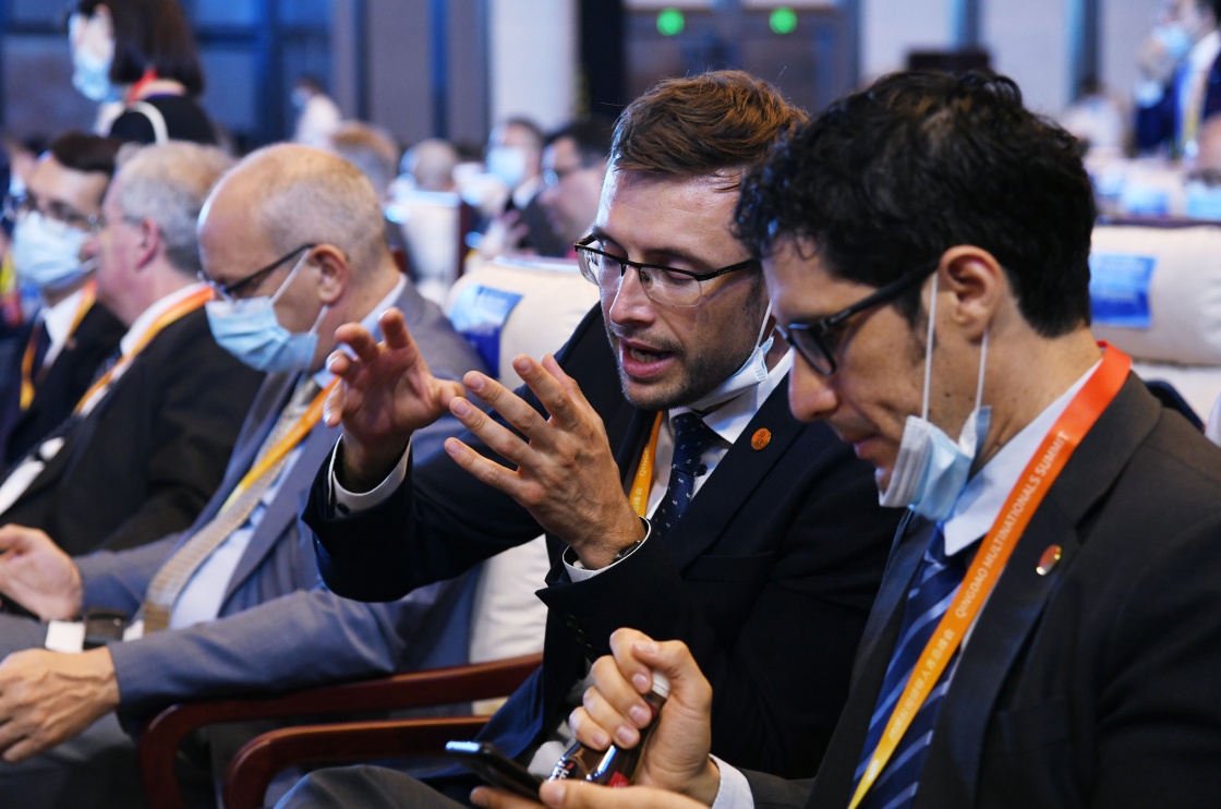 7月15日,与会嘉宾在第二届跨国公司领导人青岛峰会上交流。新华社记者 李紫恒 摄
