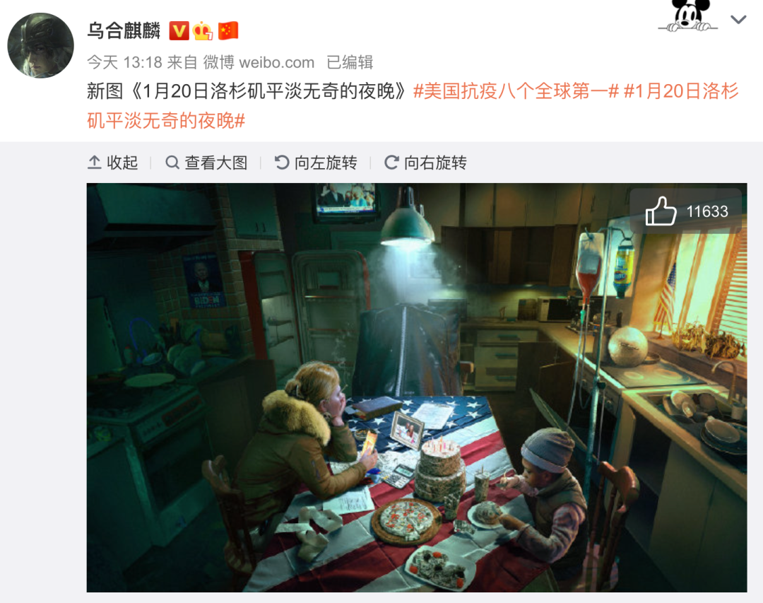 画家@乌合麒麟 发布新作《1月20日洛杉矶平淡无奇的夜晚》,通过描绘洛杉矶一个家庭厨房的场景,揭露了彭博社这一言论的荒谬性。