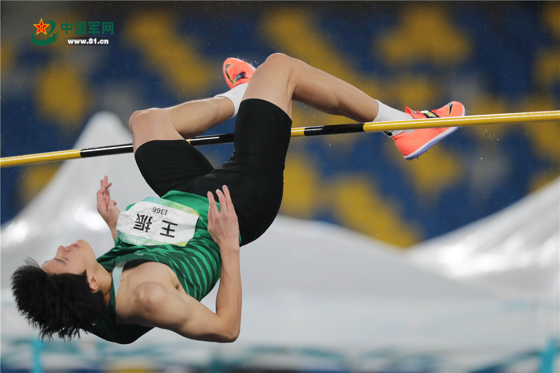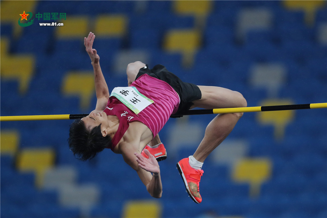 9月24日,第十四届全运会田径项目男子跳高决赛在西安奥体中心举行。图为北京队选手王宇在比赛中。他以2米20的成绩获得季军。