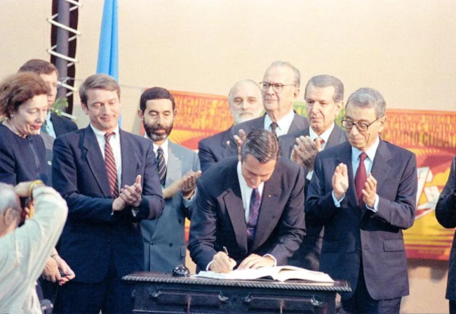 △1992 年里约大会上,各国领导人在时任联合国秘书长布特罗斯·加利(右)的见证下踊跃签署《生物多样性公约》。但美国时任总统老布什没有签署。