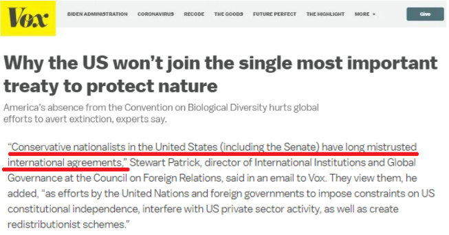 △美国沃克斯新闻网站(VOX)在文章《美国为什么不加入保护自然的最重要条约》中援引专家的观点指出,美国保守的民族主义者(包括参议院)长期以来一直不信任国际协议,认为它们“是联合国和外国政府对美国宪法独立性施加限制、干预美国私营部门活动以及创造再分配主义计划的努力”。