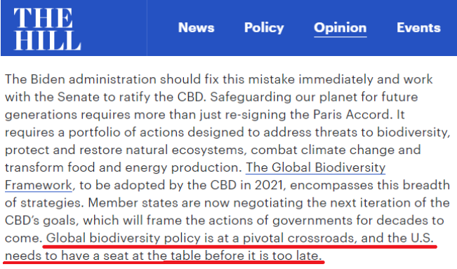 如今30年过去了,这些人的想法仍未有丝毫改变。拜登就任总统后不久,美国右翼智库就发布了一份报告,呼吁国会参议院在拜登任职期间继续抵制《生物多样性公约》等国际条约,理由依然是它们“威胁到美国主权”。