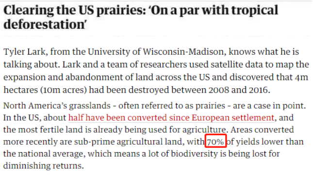 文章援引美国专家的研究成果指出,在2008年至2016年期间,美国有400万公顷土地被毁。特别是美国对大草原的破坏性开发,“相当于对热带森林的乱砍滥伐”。这片曾经在世界上面积最大的草原现在大约一半已被用于农业。而最近开发的农业用地已经降级为次优等级,其农业产量比全国平均水平低70%。