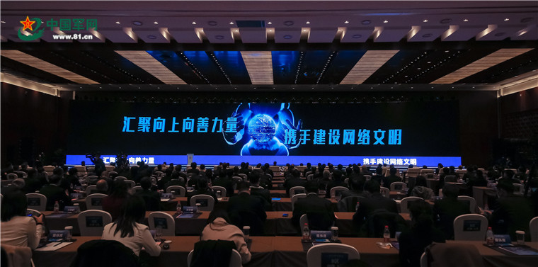看,与北京天空相呼应的“蓝色”成了大会会场的主色调。在网络空间的语境下,蓝色不仅会让人联想到“未来”与“科幻”,同时也象征着“文明”与“清朗”。中国军网记者在主论坛发布的 “新时代网络文明建设十件大事”中看到,“开展青年网络文明志愿行动,引导青少年健康成长”这一“大事”,赋予了 “清朗”更深刻的涵义。