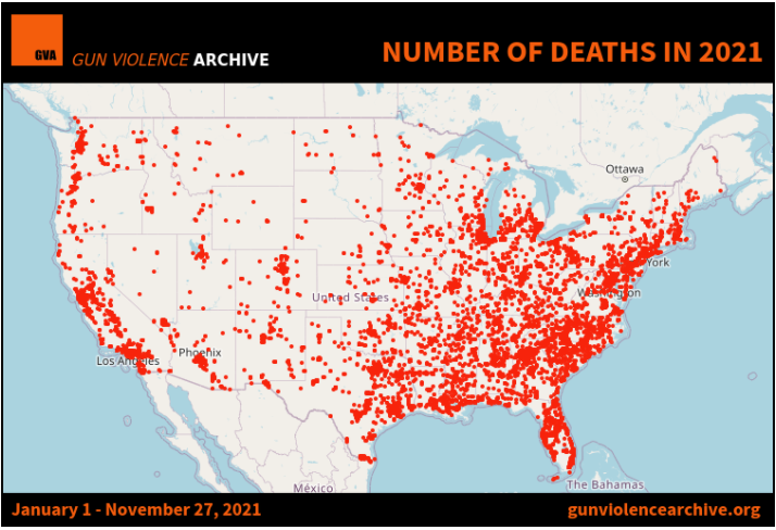 4万,这是美国大约每年死于枪击的人数。2021年,不出意料,据美国非营利组织“枪支暴力档案”(GVA)统计,截至当地时间11月27日,枪支暴力已致40600人死亡。也就是说,美国每天有超过100人死于枪击。
