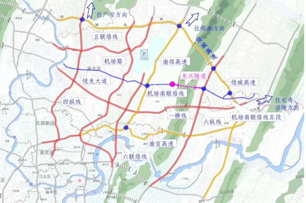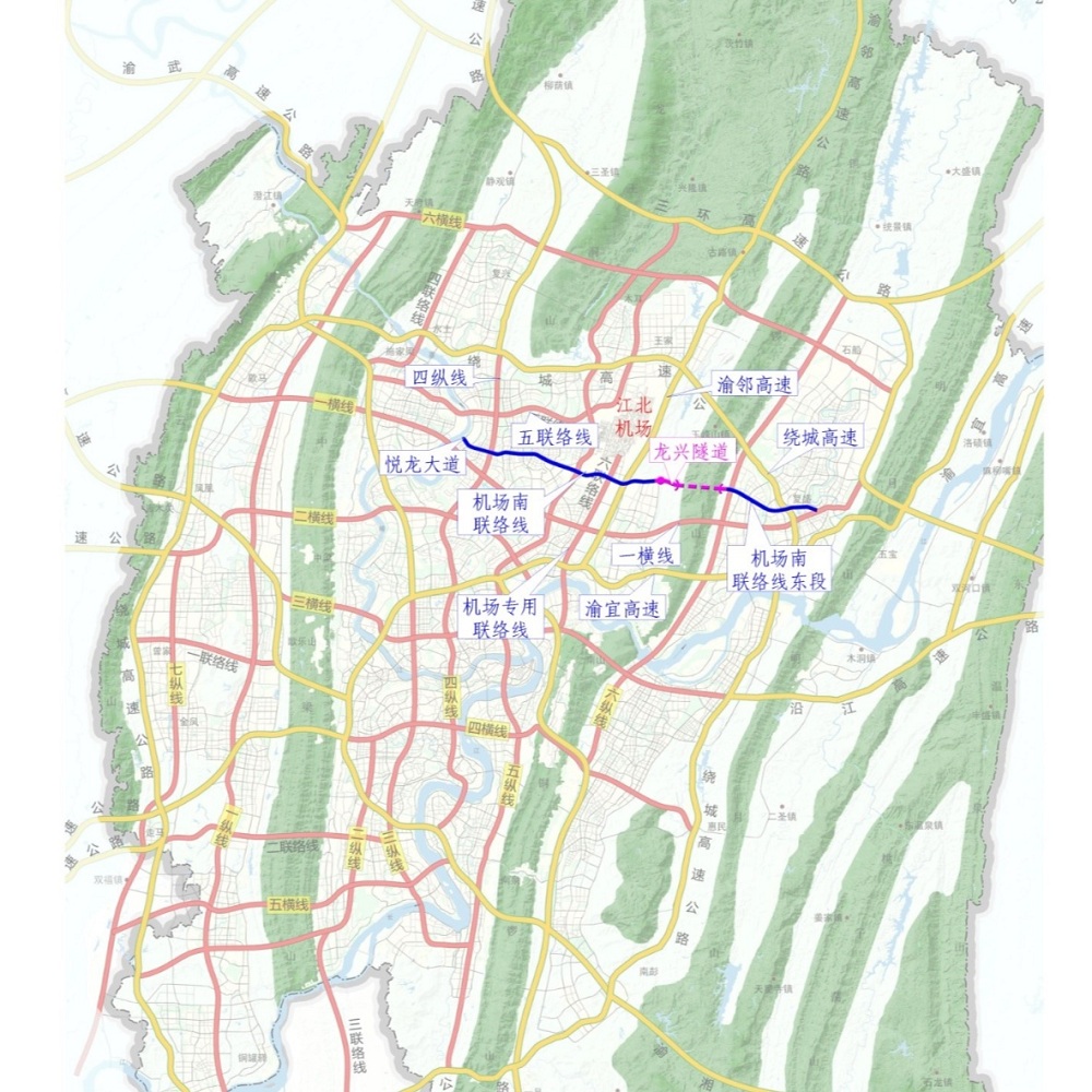 此前,龙兴往机场方向需通过绕城高速(玉峰山隧道)绕行,悦来方向需通过一横线(石坪隧道)绕行。这样不仅绕行距离远,而且造成一横线、机场高速等交通压力大。以机场为例,从龙兴前往江北机场,需通过一横线至包茂高速连接机场南联络线或通过一横线机场高速到达机场,这两种路线距离大致都为27公里左右,需要花费约30-40分钟时间。