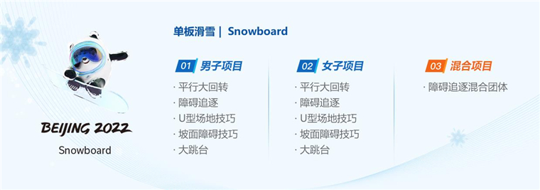 北京2022年冬奥会共设有男女U型场地技巧、坡面障碍技巧、平行大回转、大跳台和障碍追逐等项目,一共产生11枚金牌,其中障碍追逐混合团体比赛是北京冬奥会新增小项。
