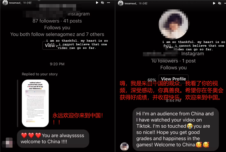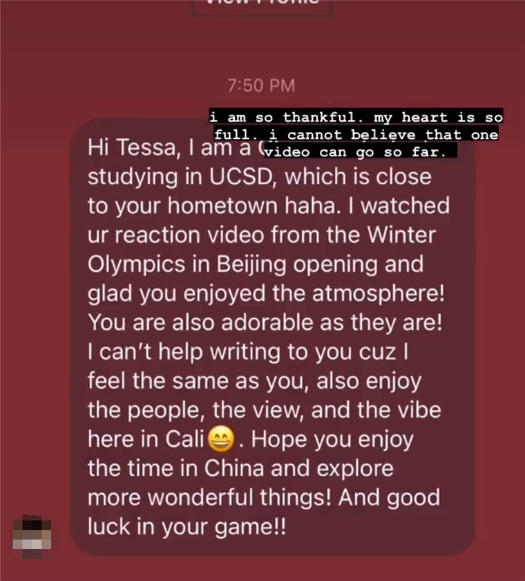 还有一名在美国留学的中国留学生透露,自己正身处距离泰莎家乡非常近的加利福尼亚大学圣迭戈分校读书,还称:“我看了你对北京冬奥会开幕式的反馈,很开心你享受那里的氛围。希望你享受在中国的时间,探寻更多精彩的瞬间。祝福你比赛好运!”