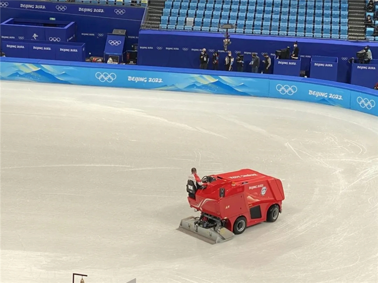 △比赛间隙,浇冰车正在平整冰面。(总台央广记者李行健 摄)