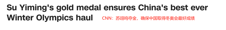 报道题为《苏翊鸣夺金,确保中国取得冬奥会最好成绩》。文章指出,刚刚收获的这枚金牌,是苏翊鸣继7日摘银后,在北京冬奥会上夺得的第二枚奖牌,也是中国代表团本届冬奥会的第六枚金牌。中国由此打破2010年温哥华冬奥会5金的纪录,作为东道主享受“最成功的冬奥会”。