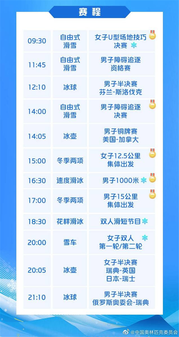 另外,当天的冰壶赛场将迎来男子铜牌赛以及两场女子半决赛。男子冰球方面,芬兰队将与斯洛伐克队争夺决赛权,另一个决赛席位将在瑞典队和俄罗斯奥委会队之间产生。