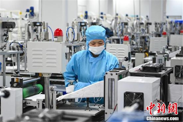 工作人员在立体口罩车间内检查KN95防疫口罩生产线运作情况。
