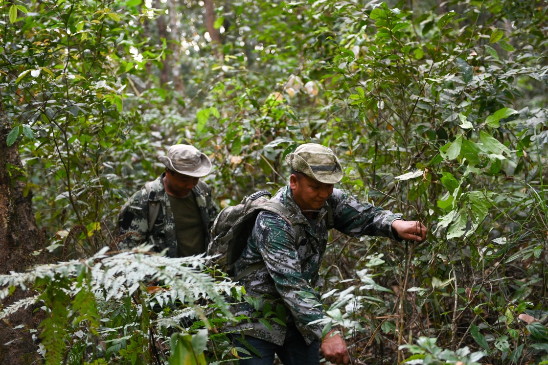 3月14日,野象监测员在景洪市大渡岗乡213国道附近的丛林中搜寻野生亚洲象。新华社记者 曹梦瑶 摄