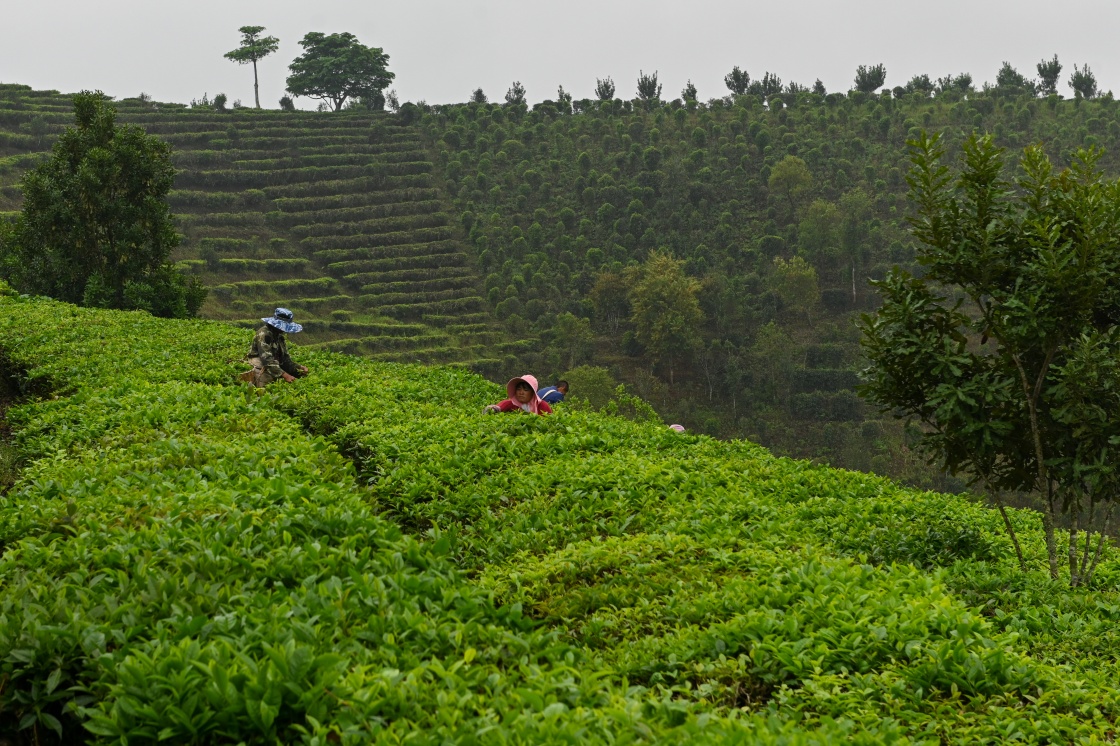 3月16日,茶农在景洪市大渡岗乡茶园森林化改造示范基地采摘茶叶。新华社记者 曹梦瑶 摄