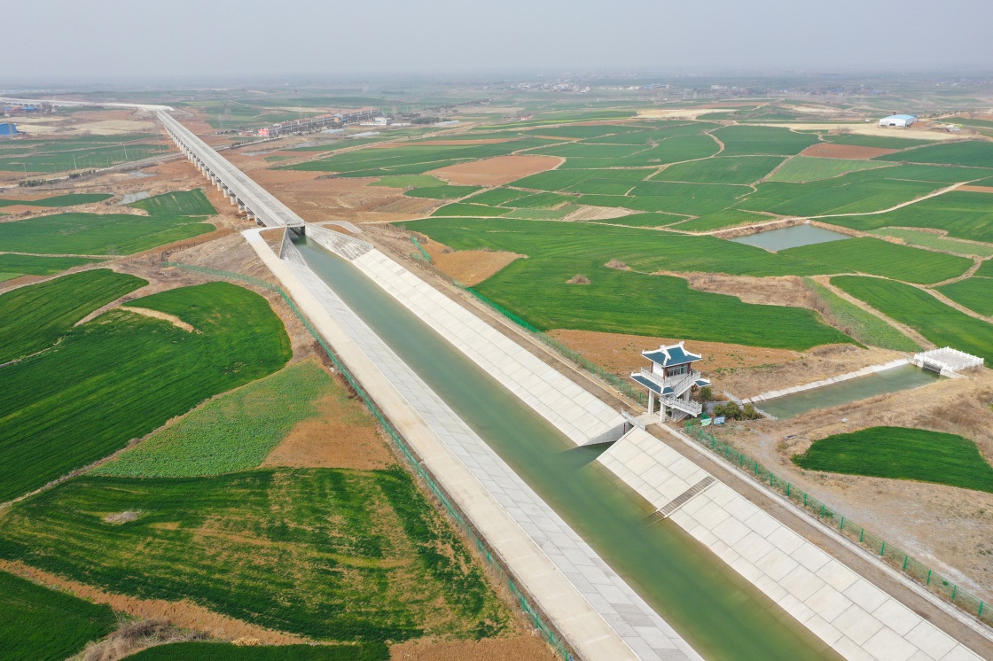 鄂北地区水资源配置工程为湖北省枣阳市境内的农田灌溉送水(3月2日摄,无人机照片)。新华社发(钟华 摄)