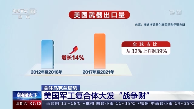 瑞典斯德哥尔摩国际和平研究所3月14日发布的全球军售趋势报告显示,2017年至2021年,5年时间里,尽管全球武器交易量较2012年至2016年相比下降4.6%,但同期美国武器出口却逆势增长14%,全球占比从32%上升到39%。