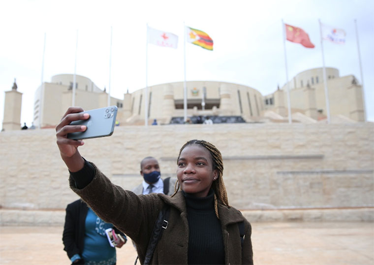 △ 6月29日,中国在南部非洲的最大援建项目津巴布韦新议会大厦举行媒体开放日,施工方宣布项目已竣工并通过验收。新议会大厦位于汉普登山新城,总建筑面积3.3万平方米,建成后成为当地的地标性建筑。图为一名女子在新议会大厦前留影。 新华社发(肖恩·朱萨摄)