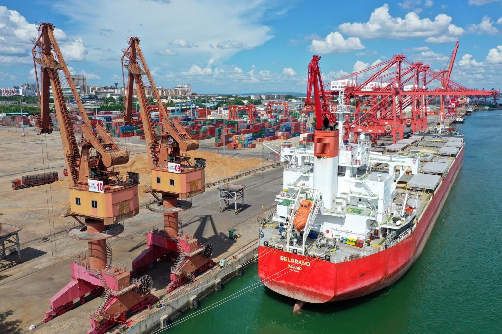 7月22日,满载巴西大豆的“贝尔格拉诺”号轮停靠在洋浦港准备卸货。新华社记者 郭程 摄