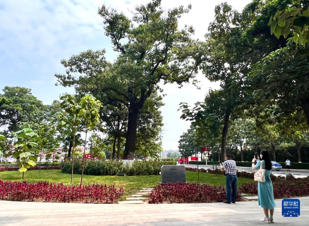 在河南省兰考县焦裕禄干部学院门口,人们在“焦桐”下参观(2022年8月15日摄)。新华社记者 郝源 摄