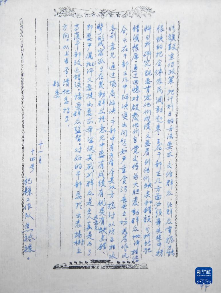 这是《杞县一区谢砦乡第一步工作报告》手稿尾页,落款为杞县工作队焦裕禄(2022年8月5日摄)。新华社记者 韩朝阳 摄