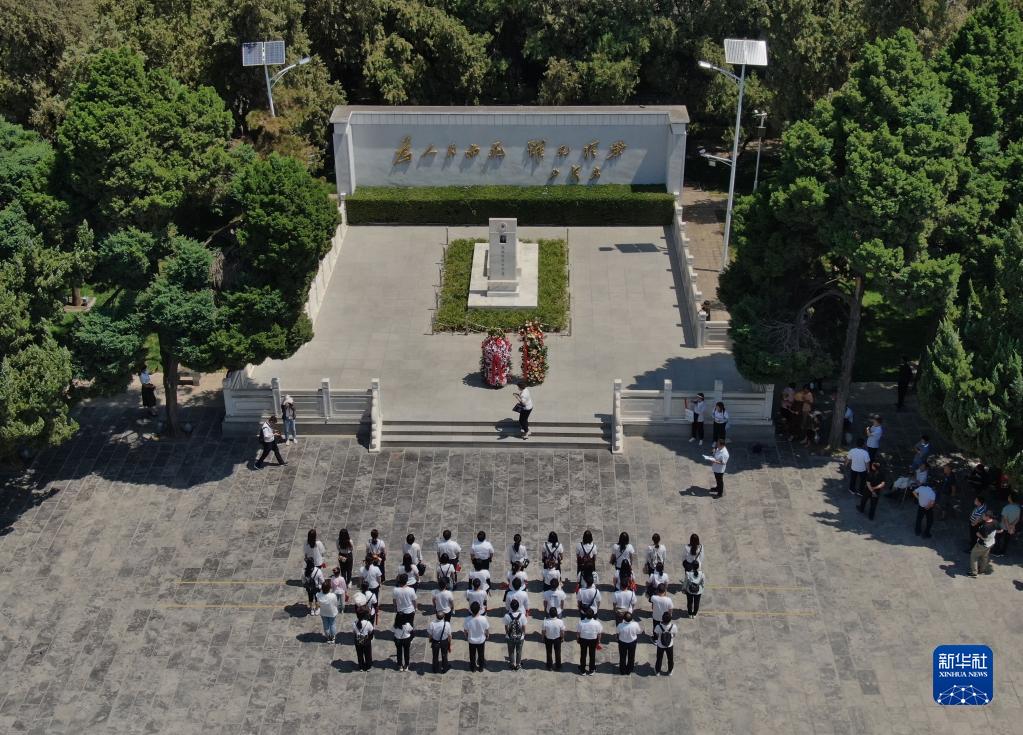参观者在位于河南省兰考县的焦裕禄纪念园瞻仰焦裕禄烈士墓(2021年6月24日摄,无人机照片)。新华社记者 李安 摄