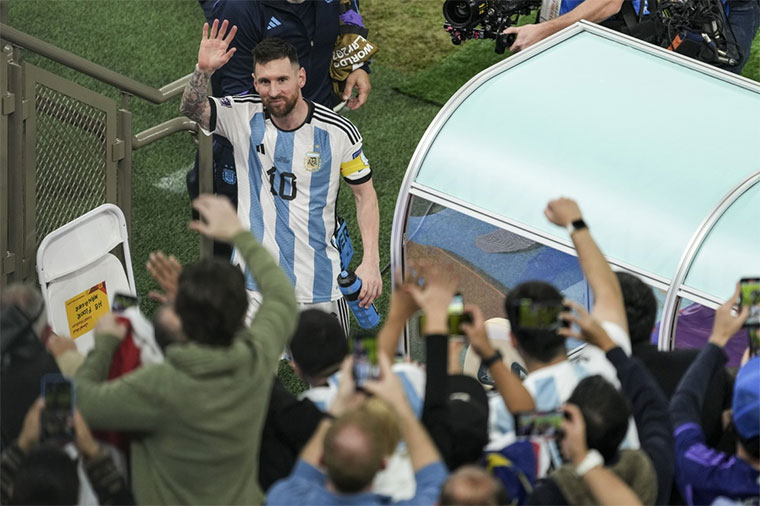 12月13日,在卡塔尔卢赛尔球场进行的2022卡塔尔世界杯足球赛半决赛中,阿根廷队以3比0战胜克罗地亚队,晋级决赛。图为阿根廷队球员梅西(上)在比赛后向观众致意。 新华社记者 肖艺九 摄