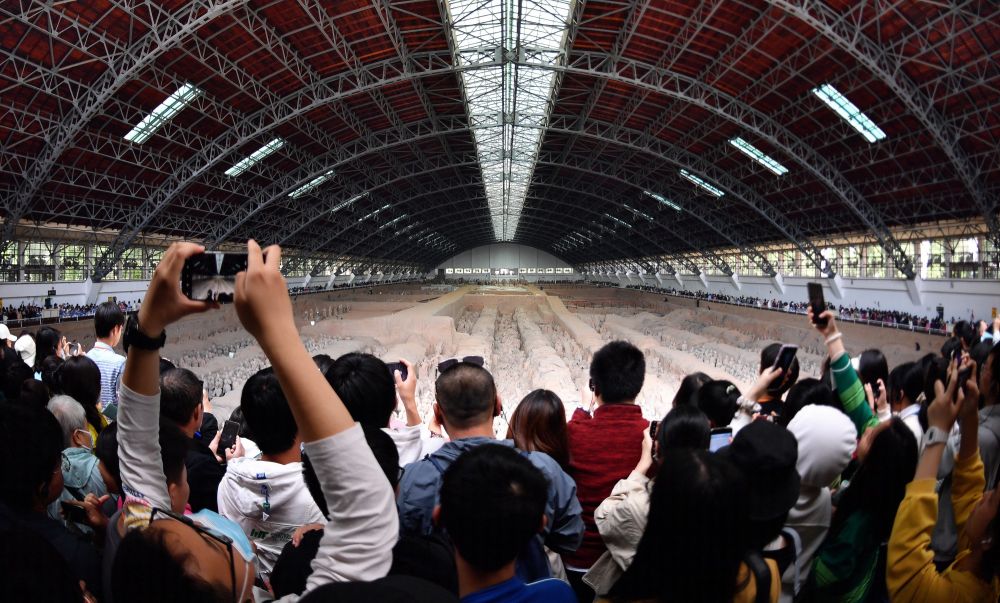游客在秦兵马俑一号坑遗址参观(2023年4月26日摄)。新华社记者 刘潇 摄