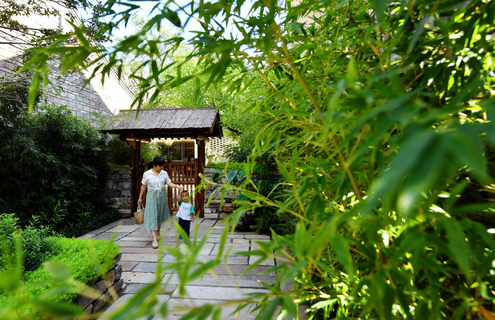 游客行走在西安市长安区秦岭终南山脚下的一个民宿内(2022年7月24日摄)。新华社记者 刘潇 摄