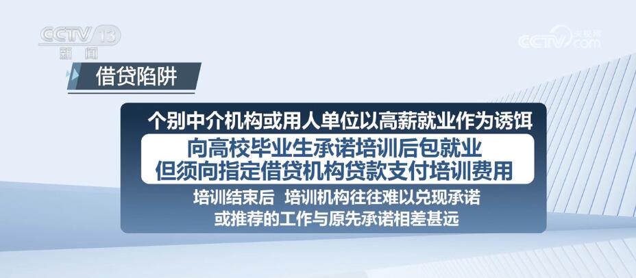 个别中介机构或用人单位以高薪就业作为诱饵,向高校毕业生承诺培训后包就业,但须向指定借贷机构贷款支付培训费用。培训结束后,培训机构往往难以兑现承诺,或推荐的工作与原先承诺相差甚远。
