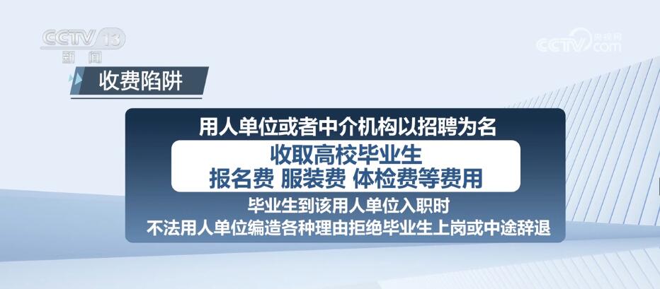 用人单位或者中介机构以招聘为名,收取高校毕业生报名费、服装费、体检费等费用。毕业生到该用人单位入职时,不法用人单位编造各种理由拒绝毕业生上岗或中途辞退。