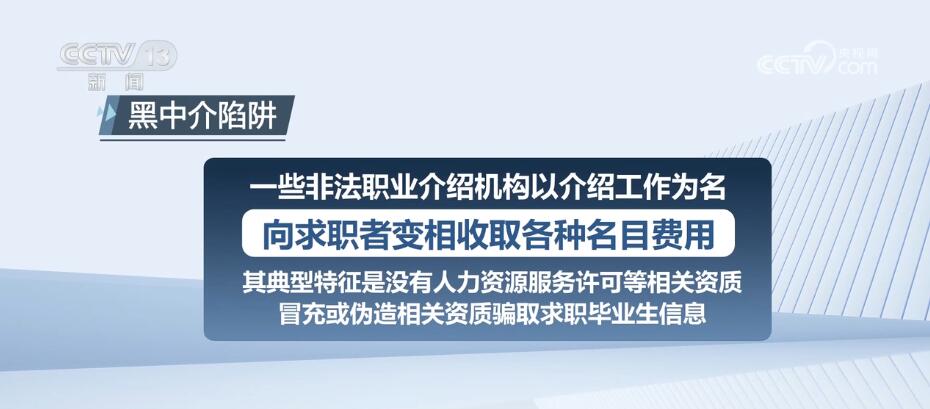 一些非法职业介绍机构以介绍工作为名,向求职者变相收取各种名目费用,其典型特征是没有人力资源服务许可等相关资质,冒充或伪造相关资质骗取求职毕业生信息。高校毕业生与市场中介机构签订协议时,不要轻信其口头承诺,一定要看清签约的内容,不要盲目签字。