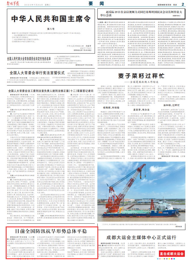 新华社北京7月25日电 (记者周圆、王聿昊)应急管理部副部长王道席25日表示,全国已进入“七下八上”防汛关键期,目前全国防汛抗旱形势总体平稳。