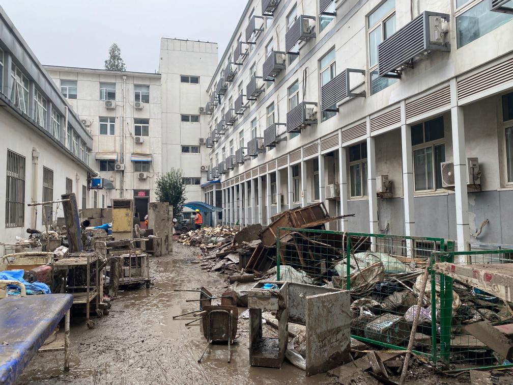 7月31日的暴雨已经过去半个月了,但洪水袭击过后的门头沟区医院仍一片狼藉:轰鸣的抽水机还在从地下室抽排积水;损坏的桌椅、柜子、设备散落在大院里,正等待被清运;楼道走廊半人高的污渍水印清晰而刺目,空气中弥漫着浓烈的消毒水味儿,环卫工人和清障车来回忙碌……