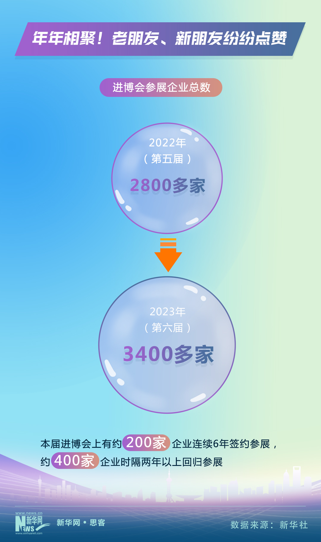 进博会这个充满机遇的舞台迎接了一批又一批参展企业。据悉,本届进博会上,超过3400家参展企业在昵称为“四叶草”的国家会展中心(上海)亮相,大大超过了上届2800多家的规模。“朋友圈”不断扩大的同时,一些“老伙伴”对进博会兴趣不减。数据统计显示,约200家企业连续6年签约参展,约400家企业时隔两年以上回归参展,再次续写它们的“进博缘分”。