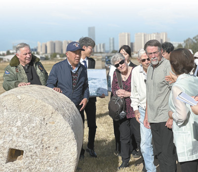 在云南昆明呈贡机场旧址,代表团一行聆听讲解员讲述石碾背后的故事。呈贡机场曾是飞虎队在昆明的主要基地之一,机场建设期间,当地人民拉动巨大石碾平整跑道,付出艰苦努力。