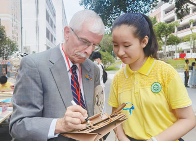 飞虎队老兵后人兰迪·斯科特为广西柳州市壶西实验中学学生留言。