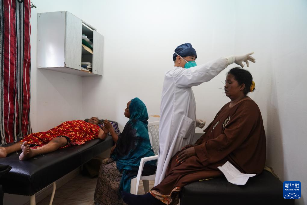 2023年2月28日,在吉布提首都吉布提市贝尔蒂耶医院,中国第21批援吉布提医疗队医生周乃忠(右二)为当地患者进行针灸治疗。新华社记者 韩旭 摄