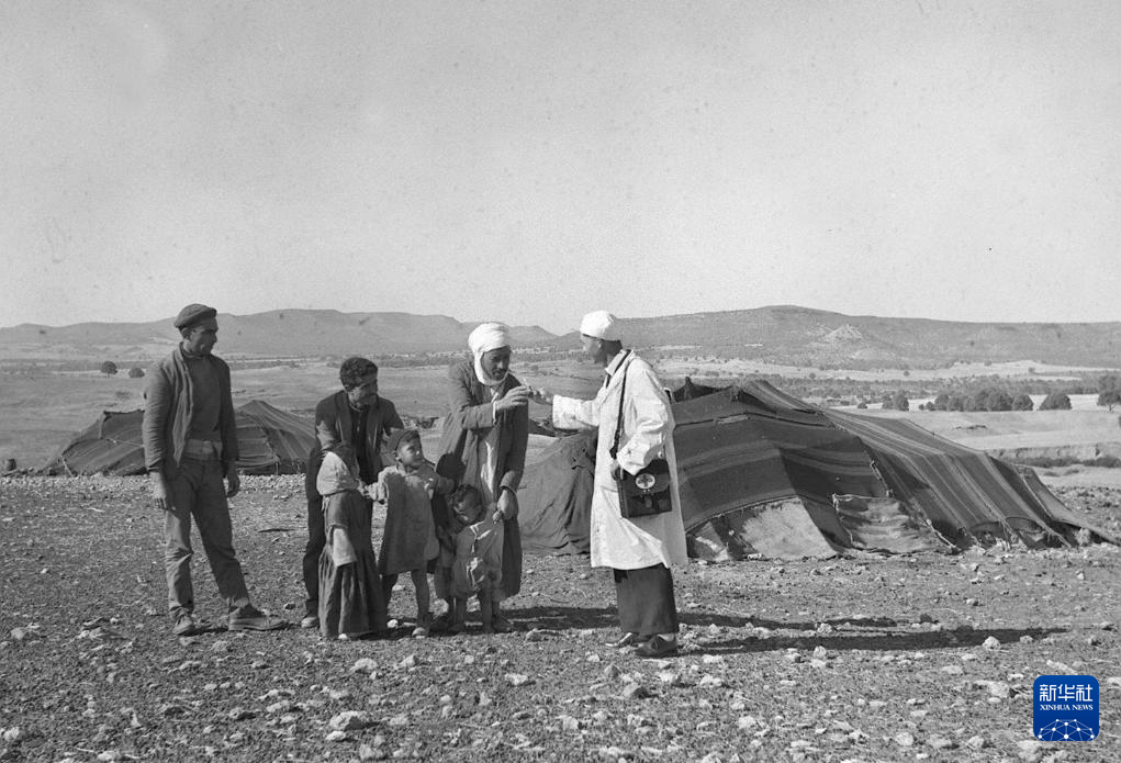 这张1965年的资料照片显示,一名中国援阿尔及利亚医疗队医生(右一)在阿尔及利亚赛伊达省为牧民诊治。新华社发(王南生摄)
