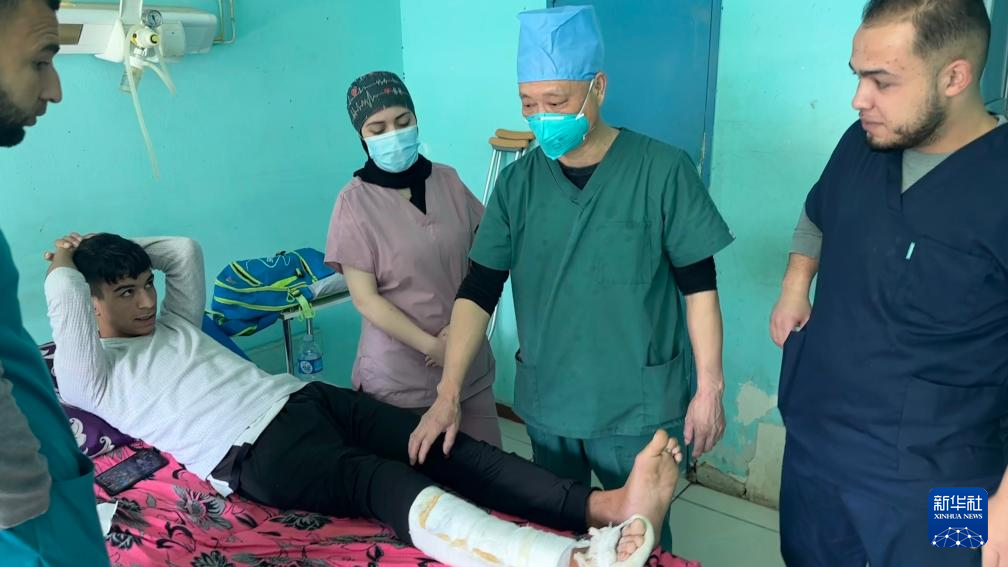 2023年3月4日,中国援阿尔及利亚医疗队医生涂大椿(右二)在阿尔及利亚艾因迪夫拉省公立医院查房。新华社发(中国援阿尔及利亚医疗队供图)