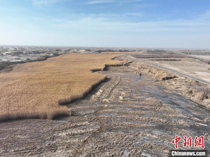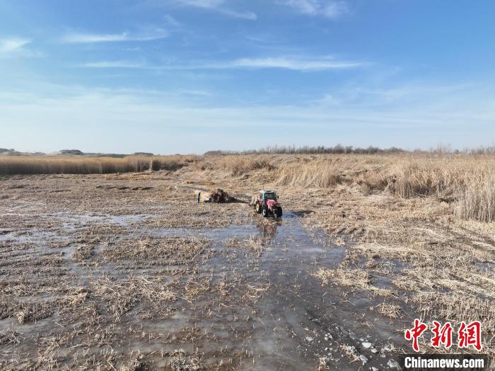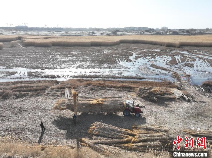 中新网乌鲁木齐1月6日电 (戚亚平 邢诗 魏红妹)自入冬以后,新疆生产建设兵团第十四师昆玉市二二五团玉泉镇万亩湿地里的芦苇进入收割季。