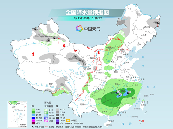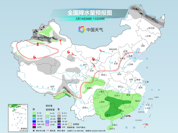 中央气象台预计,未来三天,南方大范围阴雨天气持续,新疆、西藏、黑龙江及内蒙古东北部也有降雪出没,局地有大到暴雪。